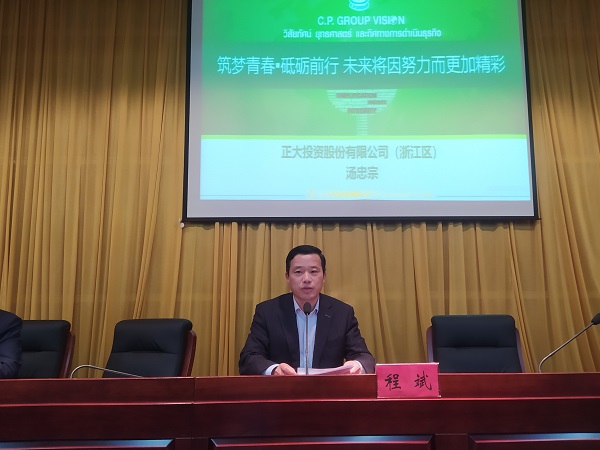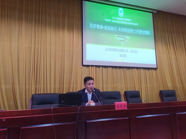 汤忠宗以图文形式向同学详细介绍了正大投资股份有限公司“利国、利民、利企业”的发展宗旨,展示了自己的就业经历,以此鼓励同学们沉淀自己,全身心投入到学习工作中,创造自身价值。最后,他借鉴正大集团董事长谢国民的话向同学们呼吁要边干、边学、边锻炼,在实践中做出一番事业。