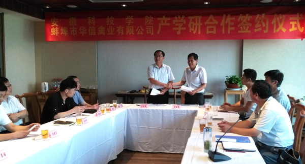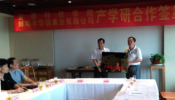 仪式上,学校与蚌埠市华信禽业有限公司签订了产学研合作协议,并举行了“产学研合作基地”授牌仪式。(特约通讯员:胡文靖摄影:戴四发等)