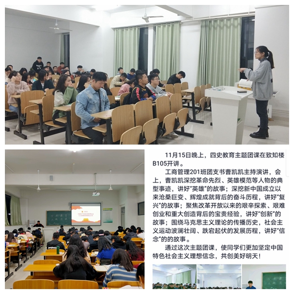 各班级团支部以“英雄、复兴、创新、信念”为主题,通过开展以“四史”为主题的团日活动,以学习强国为依托,观看来国史——《国史讲堂》、党史——《中国共产党史专题讲座》、改革开放史——《我们一起走过》、《必由之路》、社会主义发展史——《正道沧桑—社会主义500年》,来带领班级团学重温长征过程中的感人故事,领略红军战士不怕牺牲、勇往直前的英雄事迹,深入了解了史实,激发了团学们爱国爱社会主义的热情。进一步增强了团员青年的使命感和责任感,更加坚定信心,树立社会主义理想信念。