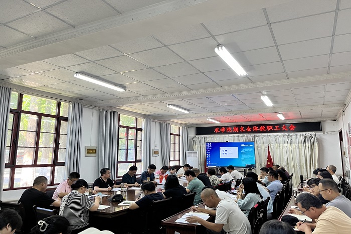 7月5日下午,农学院在学院会议室召开期末全体教职工大会,安排部署学院期末及暑期各项重点工作,会议由农学院党委副书记、院长崔广荣主持。