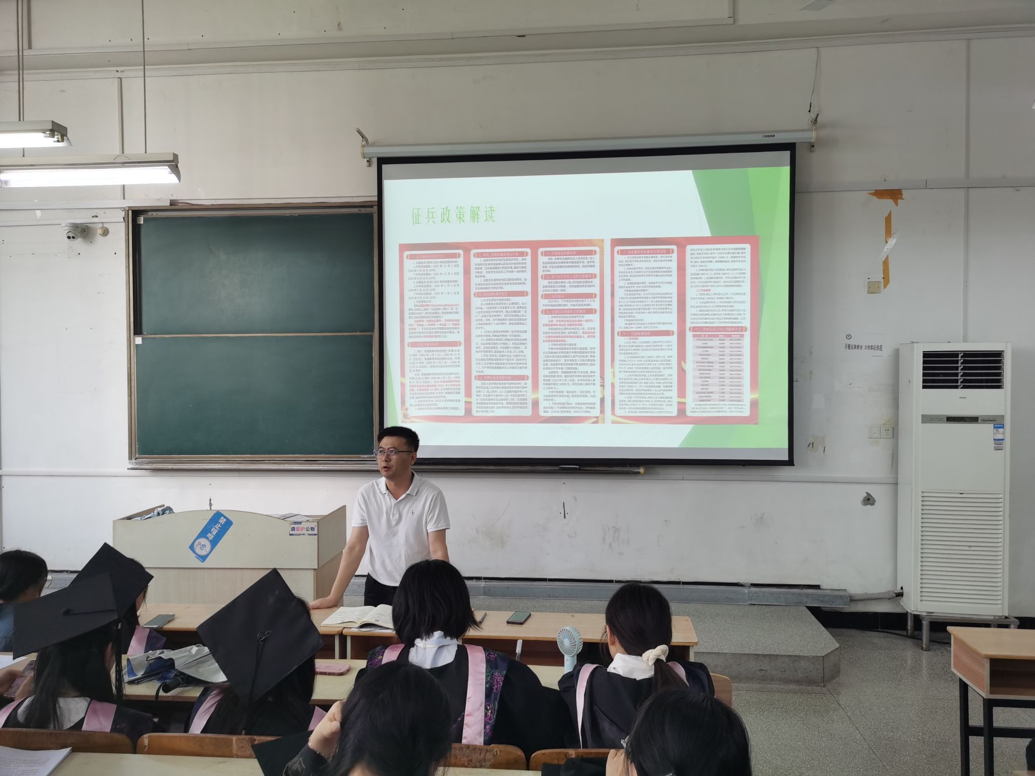 张海亮从毕业生未来发展的角度,向全体毕业生做了就业指导和征兵政策解读,并提出殷切希望。一是厚植家国情怀,强化责任担当,把个人命运同祖国发展联系在一起,勇于到军营锻炼自己,为国防建设贡献力量;二是学会悦纳自己,认清自己的短板,勇敢面对自己的不足,实事求是地选择工作岗位;三是科学判断当前就业形势,调整好就业心态,脚踏实地找到适合自己的工作。对离校前的各项工作,他要求全体毕业生,合理分配时间,认真处理好各种事项,同时注意规律作息和外出安全,确保顺利毕业。